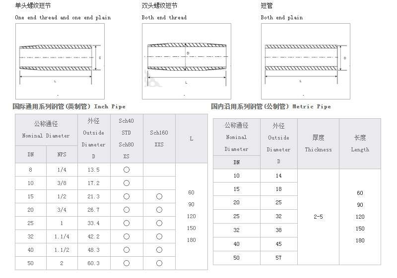 短節是工業管道連接中常用的一種配件。常見的有螺(luó)紋(wén)短節,分為雙頭外絲、單(dān)頭(tóu)外絲、平頭外絲幾種,另外還有以法蘭連接的短節等。 短節分為油管短節和套管短節。管(guǎn)件連接中翻邊短節(jiē)通俗說是和法蘭配(pèi)套使用(yòng) 具體是套在法蘭內空裏 然後尾部和鋼管焊接 這個時候法蘭是可以動的 隻要是一個(gè)